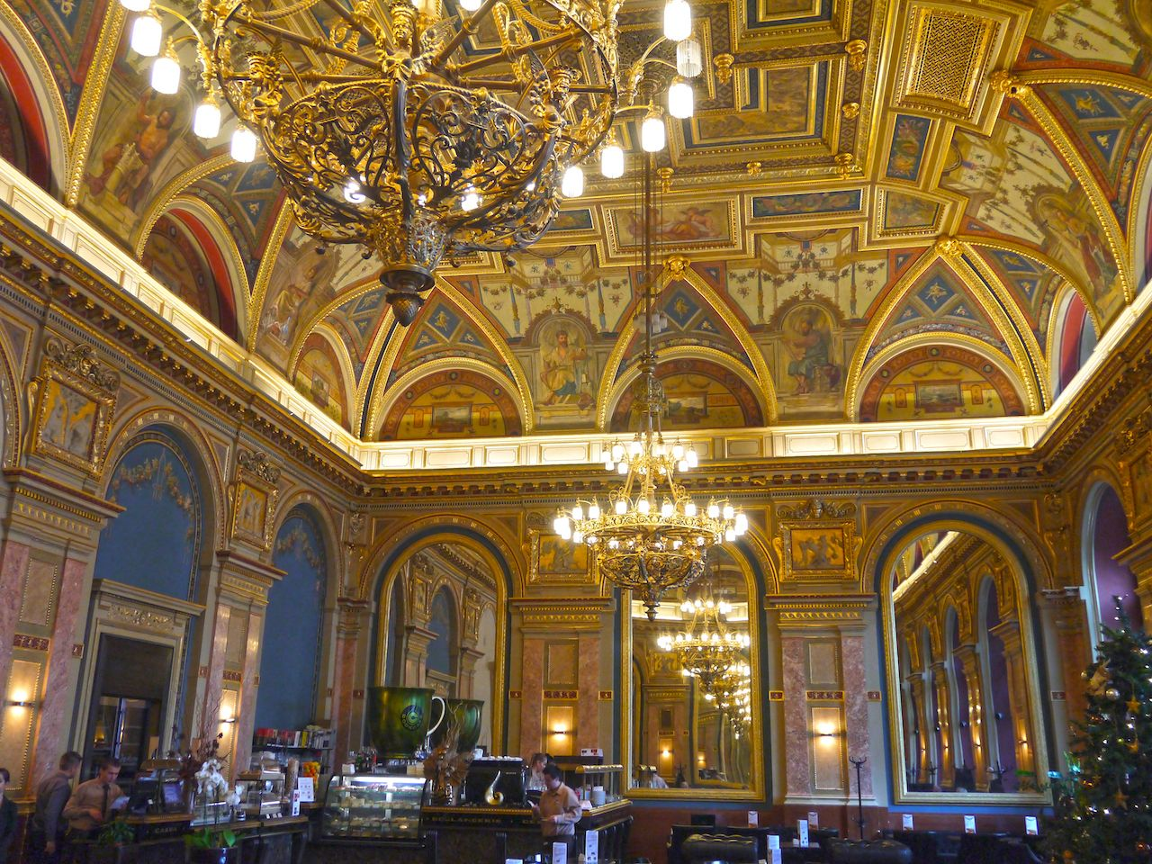 А ви колись відвідували книжкове кафе? Це неймовірне місце одразу зачаровує кожного клієнта з першого погляду. Розташоване кафе у будівлі колишнього торговельного центру на другому поверсі. Інтер’єр закладу нагадує справжній палац: високі стелі, домінування золотого кольору, великі вікна, гігантські люстри. Приміщення, в якому розташувалося кафе, було побудовано у 1884 році. Колись давно тут було казино. Його стіни прикрашали розписи у стилі артнуво. У XXI столітті тут можна послухати фортепіано та насолодитися тістечками, кавою та іншими легкими стравами.
